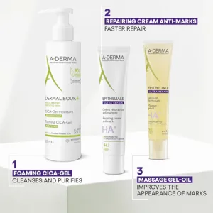 Formula, 16 puta koncentriranija u hijaluronskoj kiselini, EPITHELIALE ULTRA REPAIR krema za obnovu⁵, testirana nakon pilinga, nakon laserskog tretmana i na reepiteliziranoj tetoviranoj koži, ima trostruko djelovanje: obnavljanje, smanjenje tragova i umirivanje.