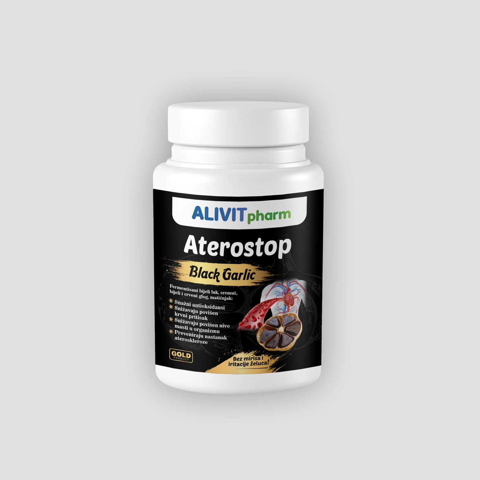 CRNI ČEŠNJAK ATEROSTOP tvrde kapsule bogat su izvor aktivnih materija iz fermentiranih lukovica češnjaka, lista sremuša, lista bijelog i crvenog gloga sa cvetovima i lista matičnjaka.