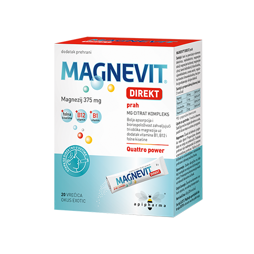 Magnevit® direkt citrat kompleks prah doprinosi boljoj apsorpciji i većoj učinkovitosti zahvaljujući tri oblika magnezija uz dodatak vitamina B1, B12 i folne kiseline.
