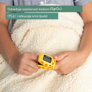 Određivanje arterijske zasićenosti kisikom (SpO2) i brzine otkucaja srca (pulsa). Vrlo jednostavno i potpuno bezbolno mjerenje unutar 8 sekundi. Prilagođeno malim dječjim prstima. Garancija 5 godina.
