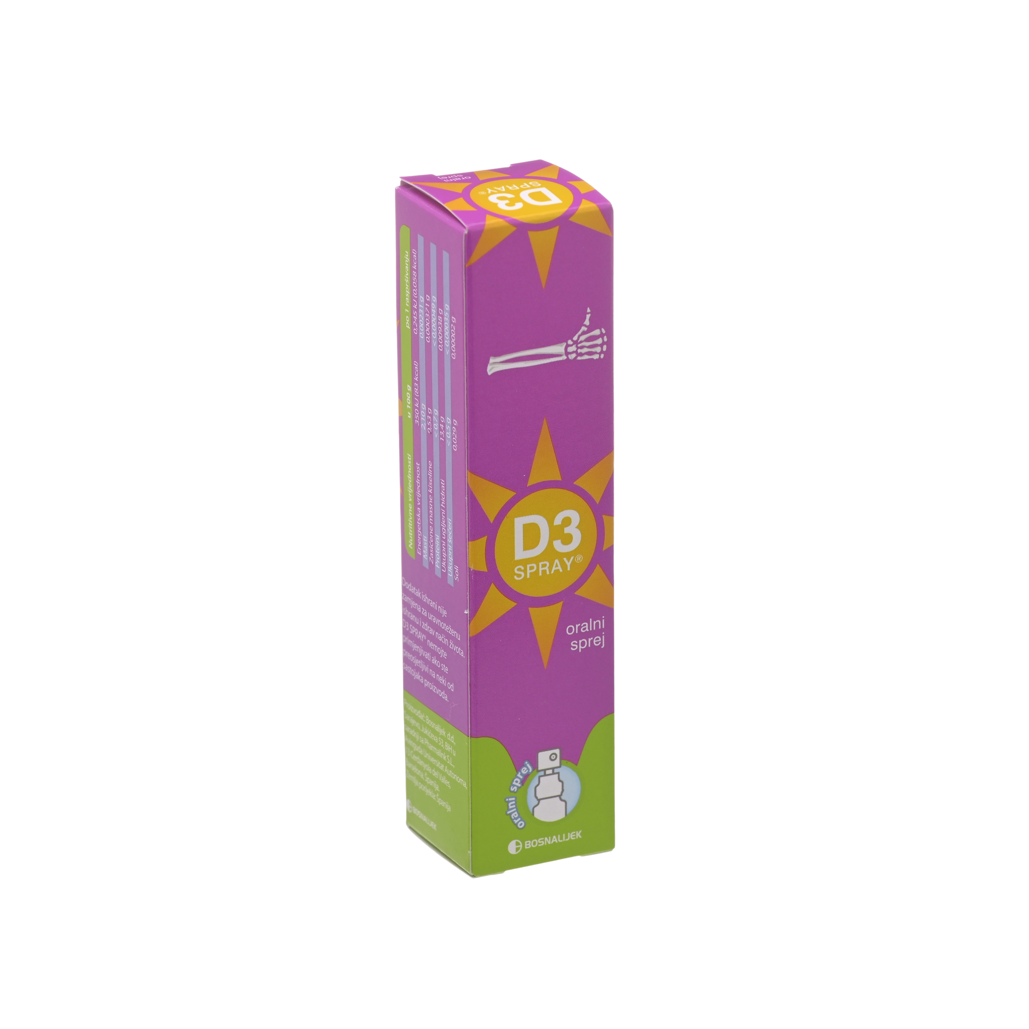 Jedan sprej sadrži 400 I.U. (10 µg) vitamina D3.