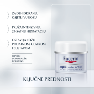 Krema Eucerin AQUAporin ACTIVE s faktorom SPF 25 i UVA zaštitom inovativna je hidracijska krema koja pojačava hidracijski sustav kože, a kožu čini podatnom, glatkom i blistavom.
