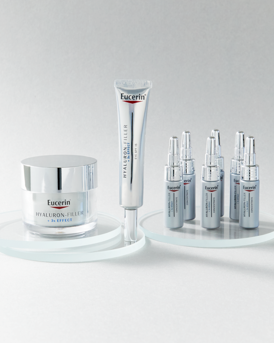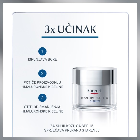 Eucerin Hyaluron-Filler dnevna krema SPF 15 s formulom 3x učinka suzbija ovaj proces: