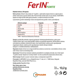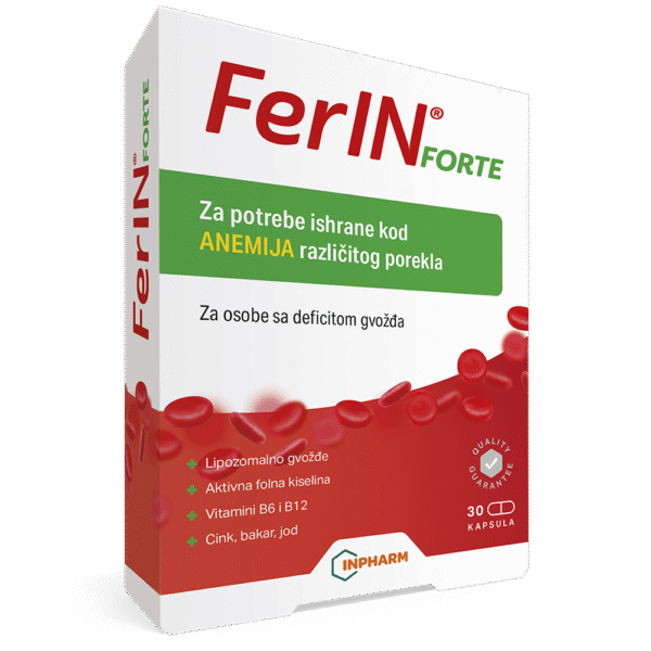 FerIN® forte je dodatak prehrani s liposomalnim željezom i aktivnim oblikom folne kiseline, u kombinaciji s mineralima (cink, bakar, jod) i vitaminima (B1, B6, vitamin B12). Za potrebe prehrane kod anemija različitog podrijetla.