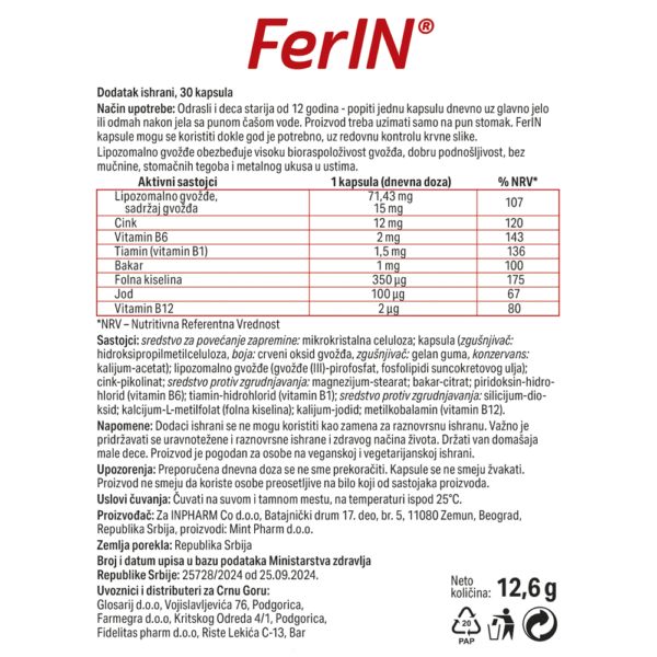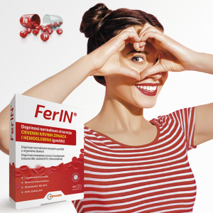 FerIN je dodatak prehrani s liposomalnim željezom i aktivnim oblikom folne kiseline, u kombinaciji s mineralima (cink, bakar, jod) i vitaminima (B1, B6, vitamin B12). Doprinosi normalnom stvaranju crvenih krvnih zrnaca i hemoglobina.