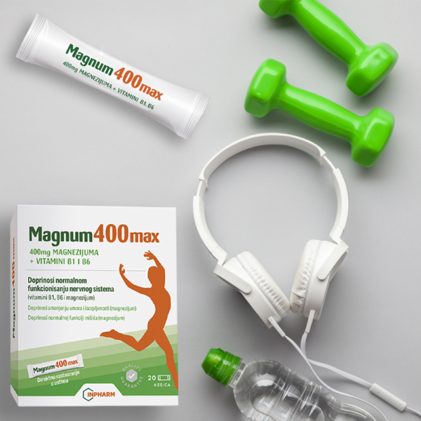 MAGNUM 400 MAX je magnezij u vrećicama bez šećera, a ima maksimalnu dopuštenu dnevnu dozu ovog važnog minerala za dodatak prehrani – 400 mg.
