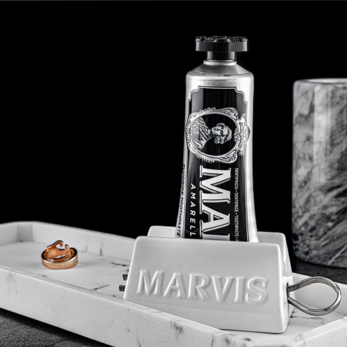 Marvis Amarelli zubna pasta s infuzijom okusa najfinijih slatkiša koje proizvodi talijanska tvrtka Amarelli i osvježavajućom aromom sladića koja nudi gorko-slatku simfoniju okusa.