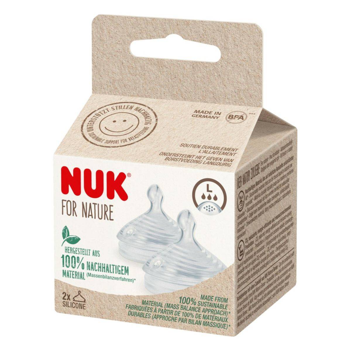Veličina S s 3 mala otvora (za spor protok pijenja), veličina M sa 6 malih otvora (za srednji protok pijenja), veličina L s 9 malih otvora (za brzi protok pijenja), bez BPA, može se kombinirati sa svim bočicama iz NUK for Nature asortimana i NUK Nature Sense priborom