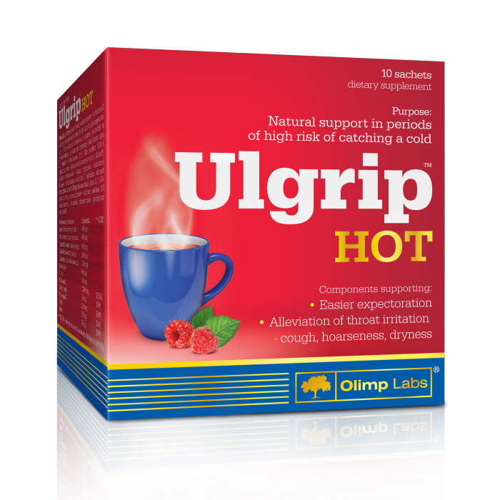 Ulgrip™ HOT je posebno formulirana kombinacija ekstrakata bazge, lipe, kamilice te vitamina (C, B6, niacin) i minerala (cink, selen), na bazi prirodnog koncentrata maline u prahu i crnog ribiza, dodatno obogaćena beta-glukanom i rutinom.