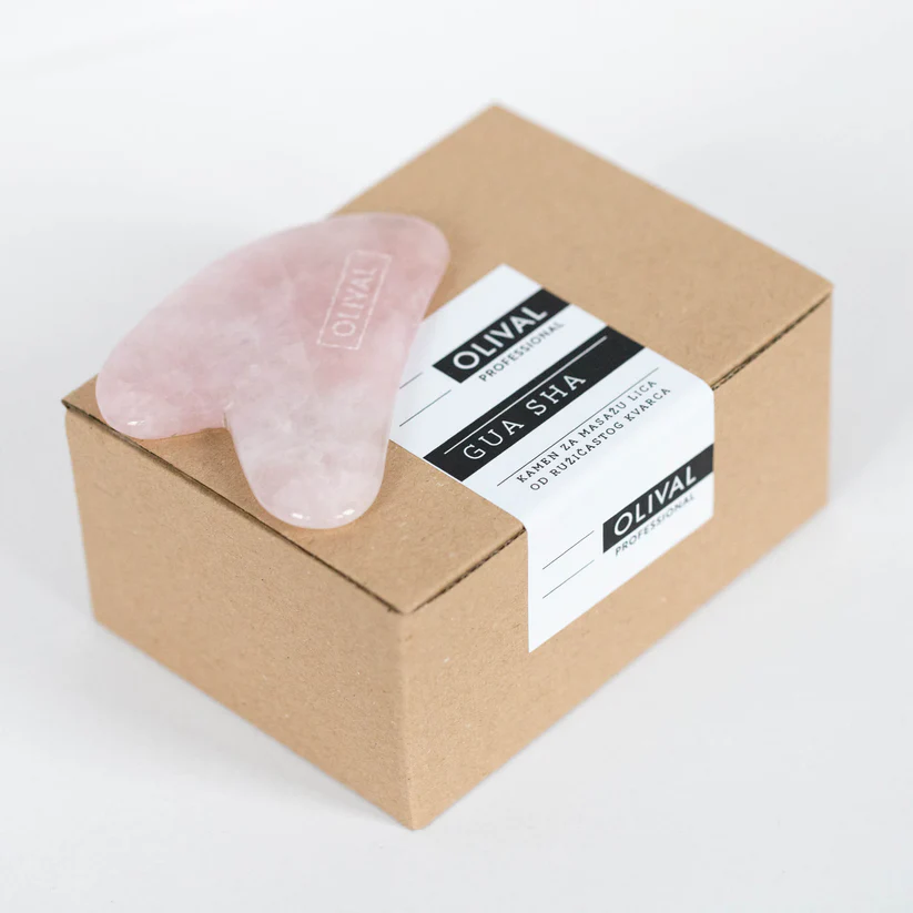 Gua sha kamen od ružičastog kvarca namijenjen je opuštajućoj masaži lica.