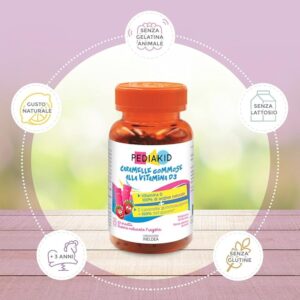 Bez želatine, glutena, laktoze, konzervansa i umjetnih aroma i boja, PEDIAKID® Vitamin D3 gumice nude praktičnu, zabavnu i zdravu formulu, idealnu za djecu od 3 godine.