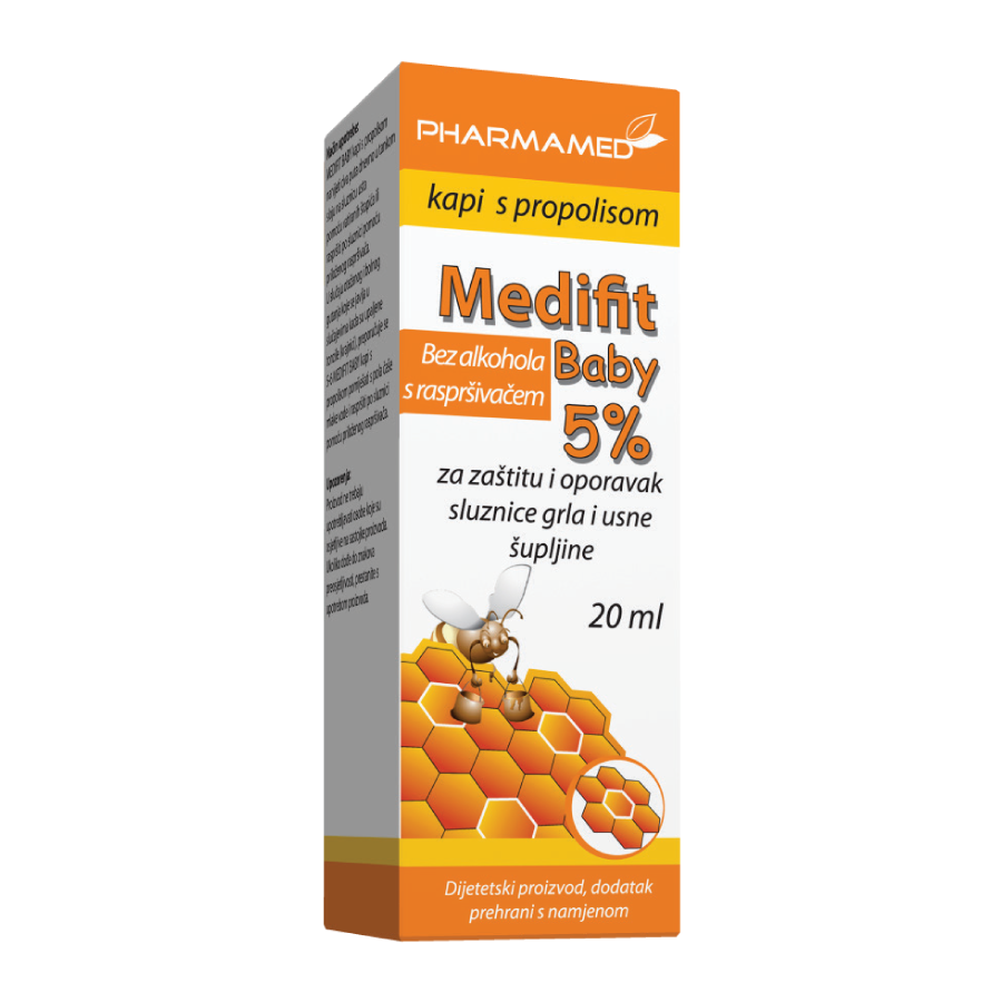 Medifit Baby kapi su dodatak prehrani koje sadrže propolis koji djeluje protiv gljivica, bakterija i virusa te su pogodne za zaštitu i oporavak sluznice grla i usne šupljine kod upalnih procesa te bolnog i otežanog gutanja.
