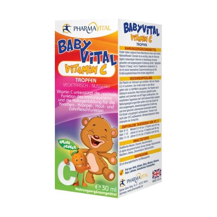 Djeca imaju vrlo visoke prehrambene potrebe u odnosu na njihov rast. Važno je da vaše dijete svakodnevno prima bitne vitamine zajedno sa zdravom i uravnoteženom prehranom. Tekuće kapi za bebe Vitamin C posebno su formulirane kako bi zadovoljile prehrambene potrebe vaše djece.
