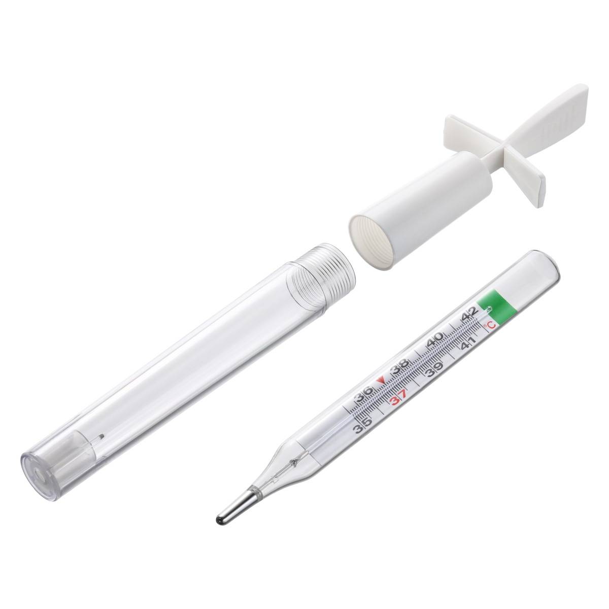 Klasični stakleni toplomjer bez žive s drškom za olakšano protresanje toplomjera.