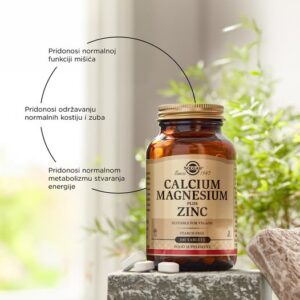 SOLGAR KALCIJ, MAGNEZIJ PLUS CINK sadrži nutrijente koji pridonose zdravlju kostiju, zuba i mišića te pridonose normalnoj funkciji mišićno-koštanog sustava i živčanog sustava.