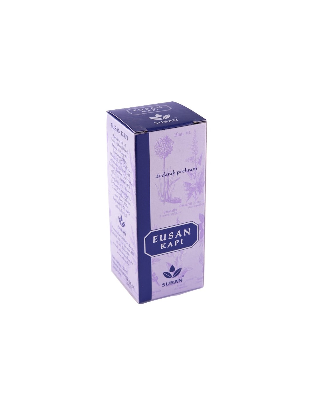Eusan kapi sadrže etanolnu iscrpinu ljekovitog bilja: list matičnjaka (Melissa officinalis, folium), korijena odoljena (Valeriana officinalis, radix), cvjetova i listova gloga (Crataegus monogyna, C. oxyacantha, folium cum flore).
