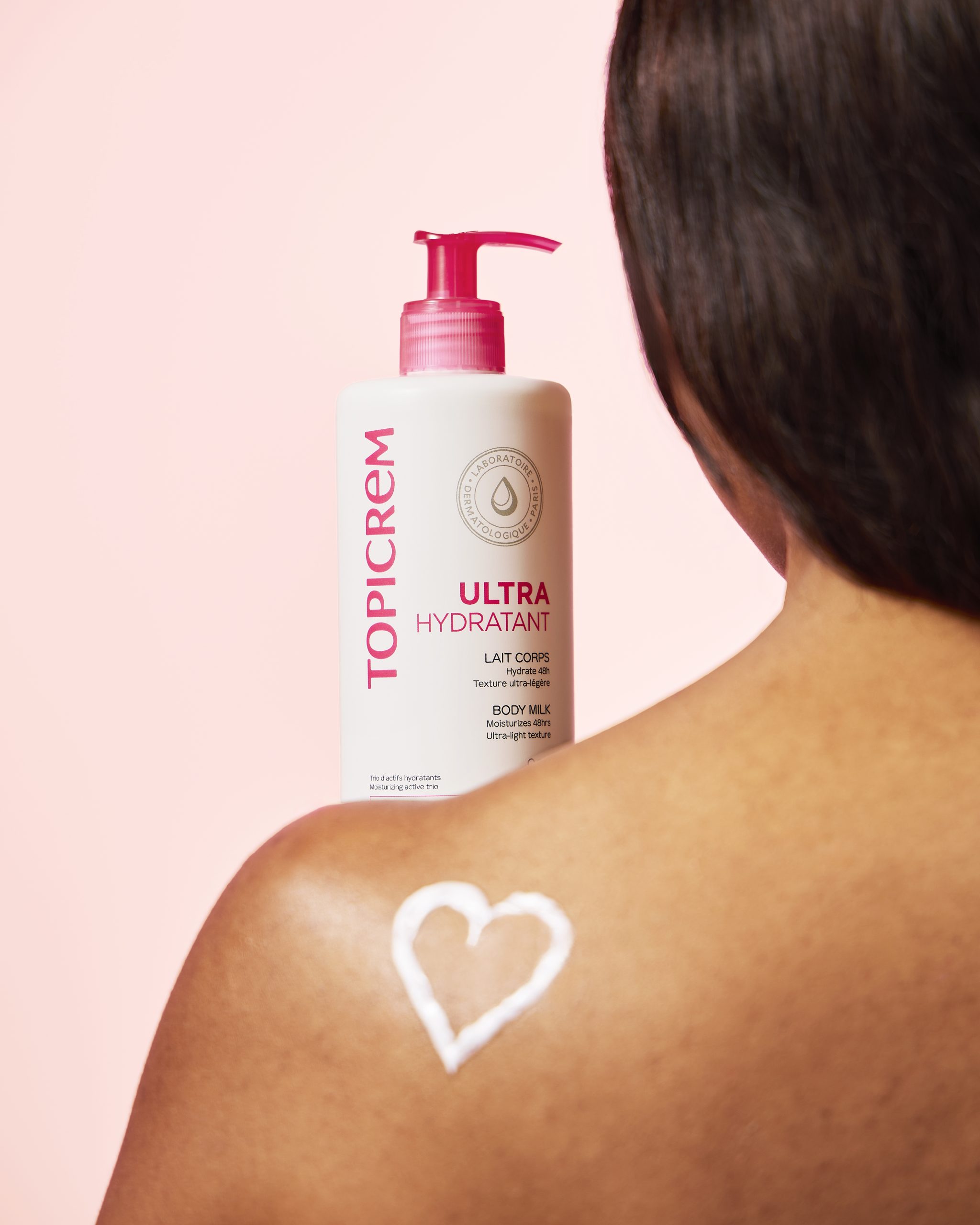 ULTRA-HIDRATANTNO mlijeko za tijelo, br. 1 u ljekarnama i najboljom koncentracijom hidratantnih i omekšujućih aktivnih sastojaka na tržištu, štiti i vlaži osjetljivu kožu cijele obitelji 48 sati.