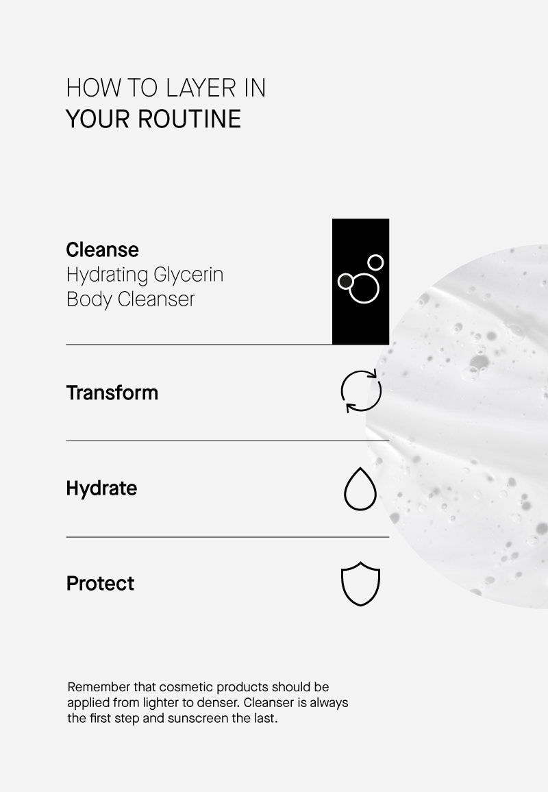 Visoka koncentracija glicerina, snažnog prirodnog hidratantnog sredstva, pomaže privući i zadržati vlagu u koži, sprječavajući isušivanje i ostavljajući vašu kožu hidratiziranom, glatkom, podatnom i blistavom nakon svake upotrebe.