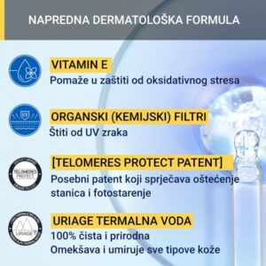 Tehnologija Skin Shield koju su razvili naši laboratoriji kombinira Uriage termalnu vodu, te jedinstveni aktivni sastojak – ekstrakt spiruline koji pomaže u zaštiti DNA i patent [TELOMERES PROTECT] koji sprječava oštećenje stanica i fotostarenje zbog UV zraka i plavog svjetla.