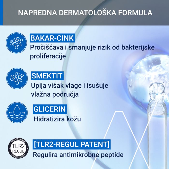 Uriage termalna voda – umiruje, patentirani TLR2-regulirajući kompleks – specifično protuupalno djelovanje, bakrov glukonat i cinkov glukonat – pročišćavaju i ograničavaju proliferaciju bakterija, smektit upija višak vlage. Bez mirisa, bez parabena.
