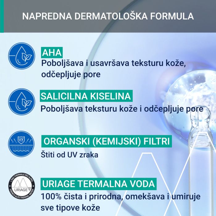 AKTIVNI SASTOJCI: AHA [mliječna kiselina] + SALICILNA KISELINA + UVA-UVB FILTERI + URIAGE TERMALNA VODA.