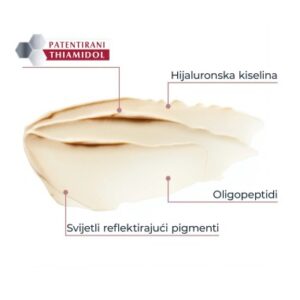 Hijaluronska kiselina smanjuje natečenost i zaglađuje fine linije i bore. Oligopeptidi stimuliraju kolagensku mrežu kože za čvršću strukturu kože.